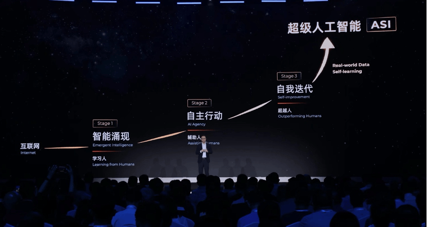 吴泳铭初次系统性地提出了通往超等人工智能(ASI)的三阶段演进线: